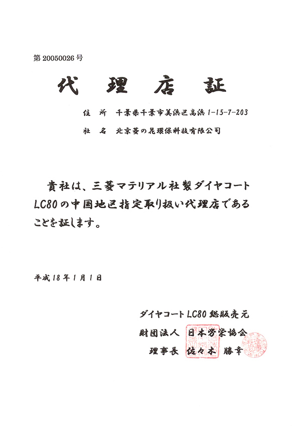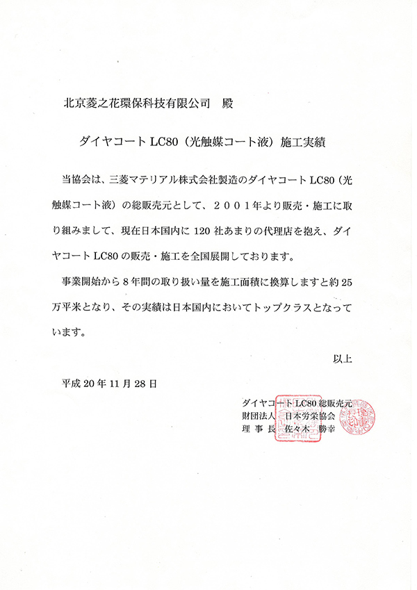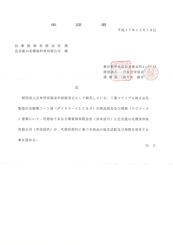 溫州泓創菱之花環保科技有限公司是日本三菱マテリァル(Dia Coat)光觸媒株式會社,(日本財團法人,日本勞榮協會)授權溫州市地區指定代理公司。